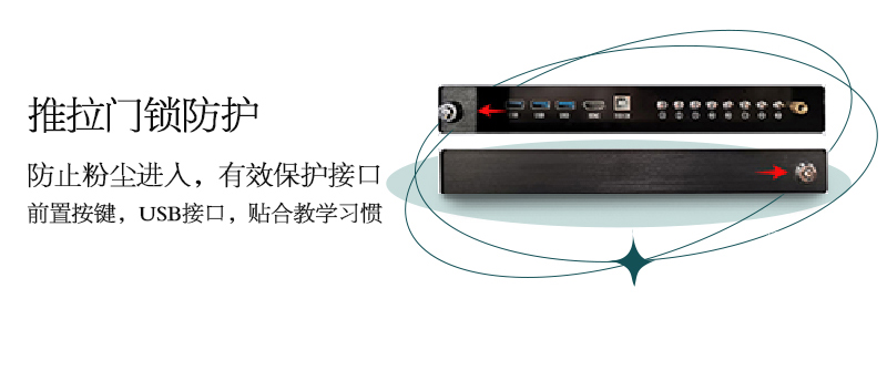 机身保护——独特的推拉门锁设计,保护前置按键及接口,还能收纳白板笔和教鞭;
